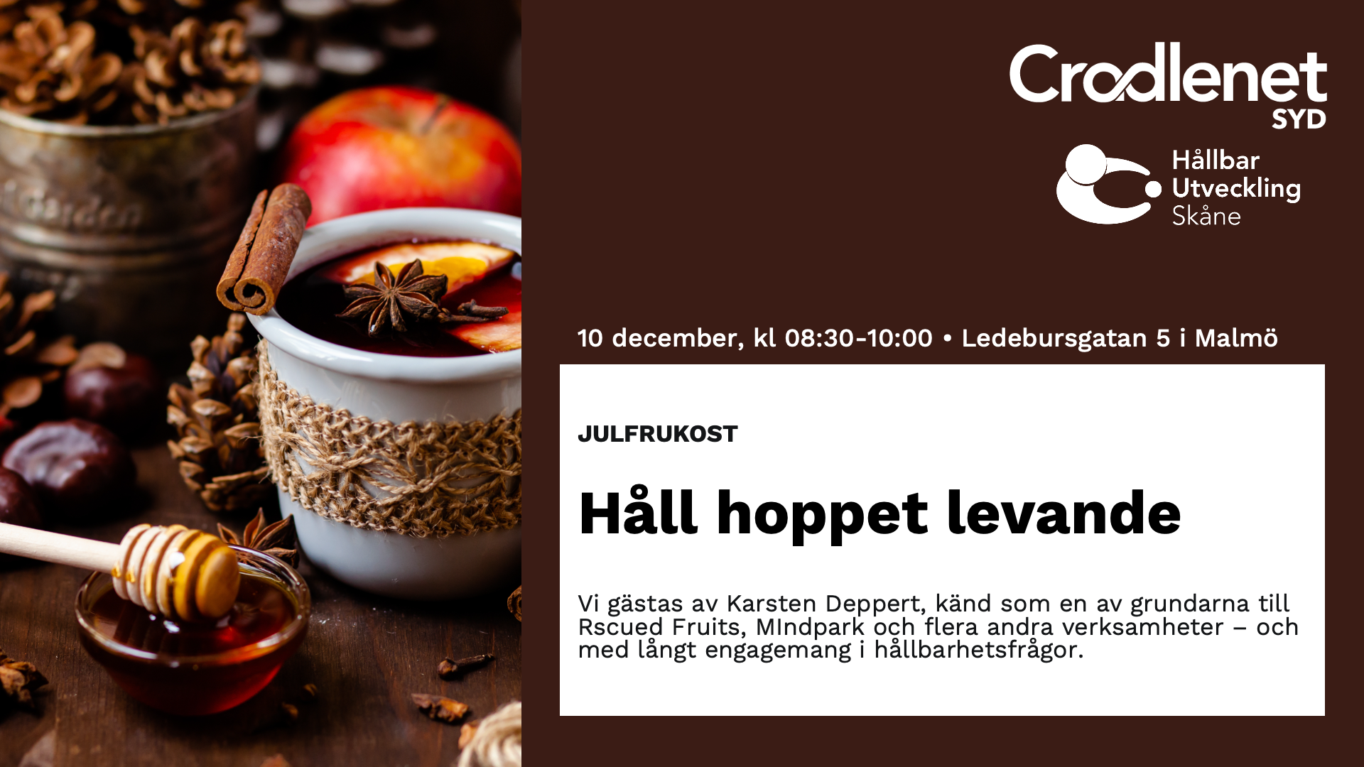 Julfrukost för Cradlenet Syd onsdag 10 december 2025 08:30 10:00 Hållbar Utveckling Skåne Ledebursgatan 5 Malmö Sverige (se karta) Google Kalender ICS Cradlenet Syd tillsammans med Hållbar Utveckling Skåne och dess andra nätverk avslutar året med en gemensam julfrukost med tema ”Hålla hoppet levande” – om att hitta kraft och framtidstro mitt i omställningens utmaningar. Läs mer och anmäl dig här senast 5 dec